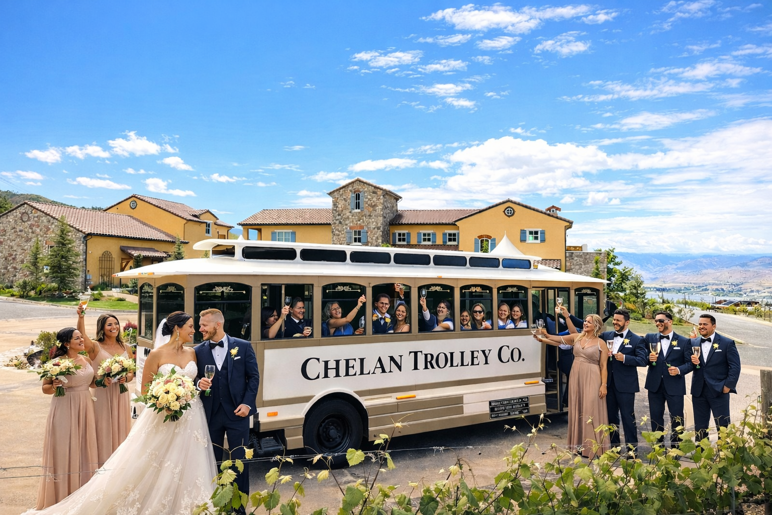 “Hop on” our Chelan Trolley and visit your favorite Lake Chelan area Wineries and locations! Chelan Trolley is also available for Private Charters, Tours and Weddings.